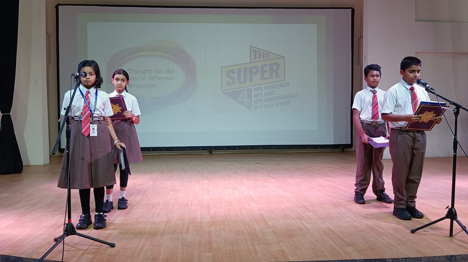 The programme began with the school prayer, followed by the National Pledge, creating an atmosphere of unity and reflection. Students then presented the Thought for the Day in English, Kannada, and Hindi. The Word of the Day, “Responsibility”, was introduced and explained, emphasizing the importance of owning one’s actions and understanding their impact on others.