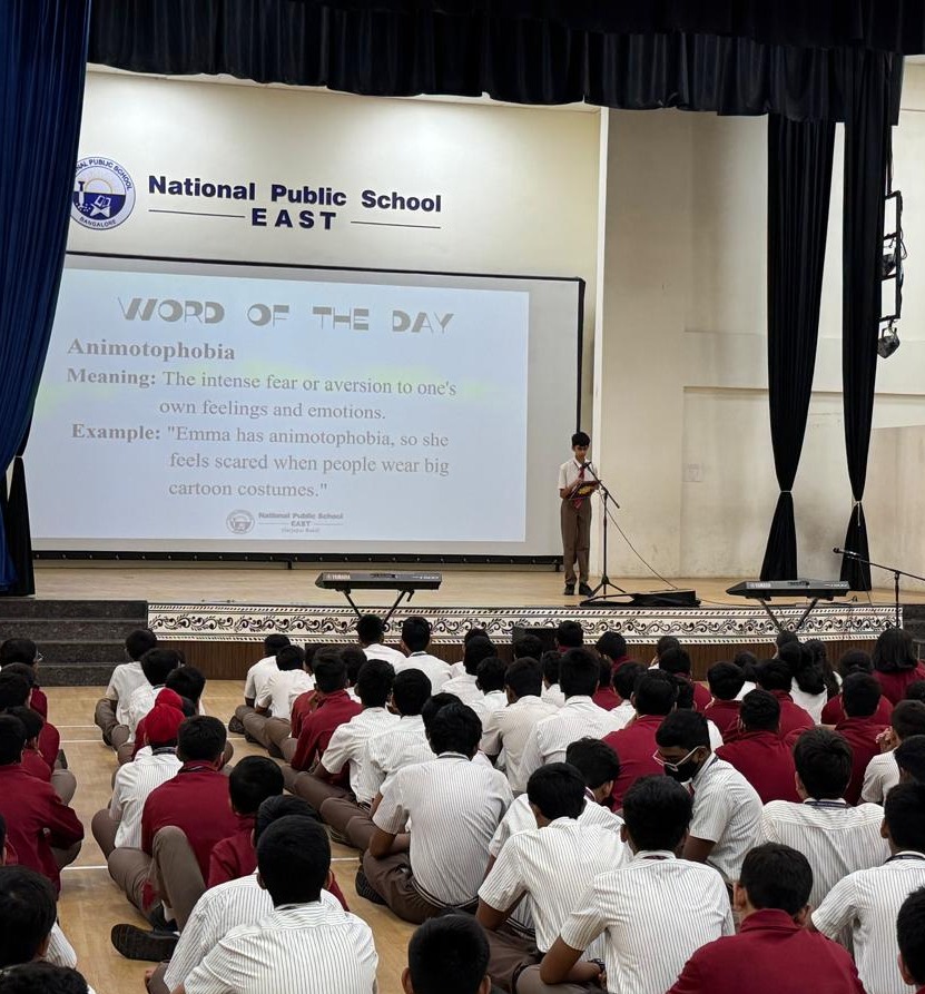 The News segment provided updates from international, national, and state events, along with sports and weather highlights. The Word of the Day, Animotophobia—the fear of one’s own emotions—was introduced with an illustrative sentence, helping expand students’ emotional vocabulary.