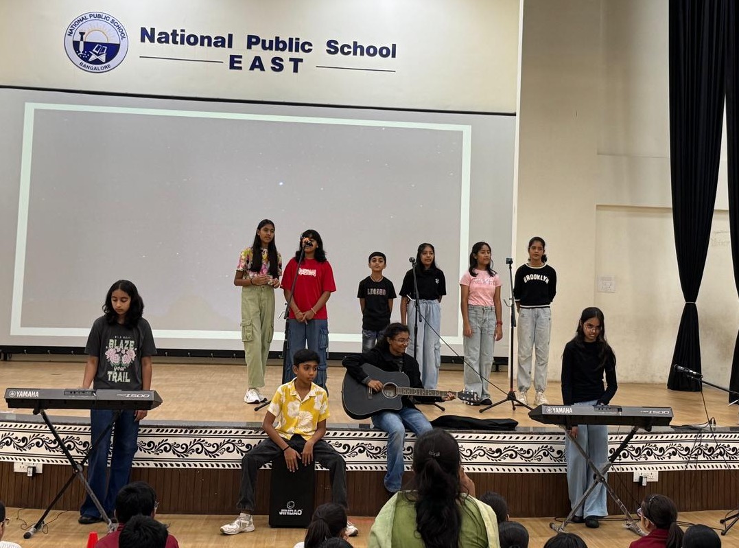 The assembly began with a soulful prayer, followed by the National Pledge, reinforcing unity and shared responsibility. Students then presented the Thought of the Day in English, Hindi, and Kannada, emphasizing how understanding our emotions strengthens mental health, decision-making, and relationships.