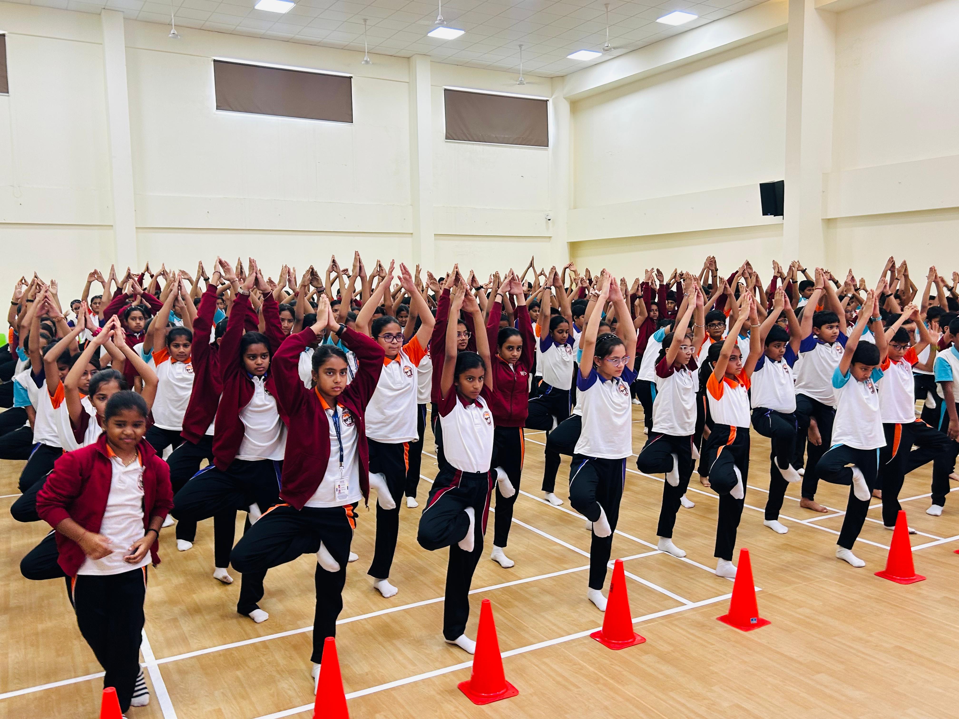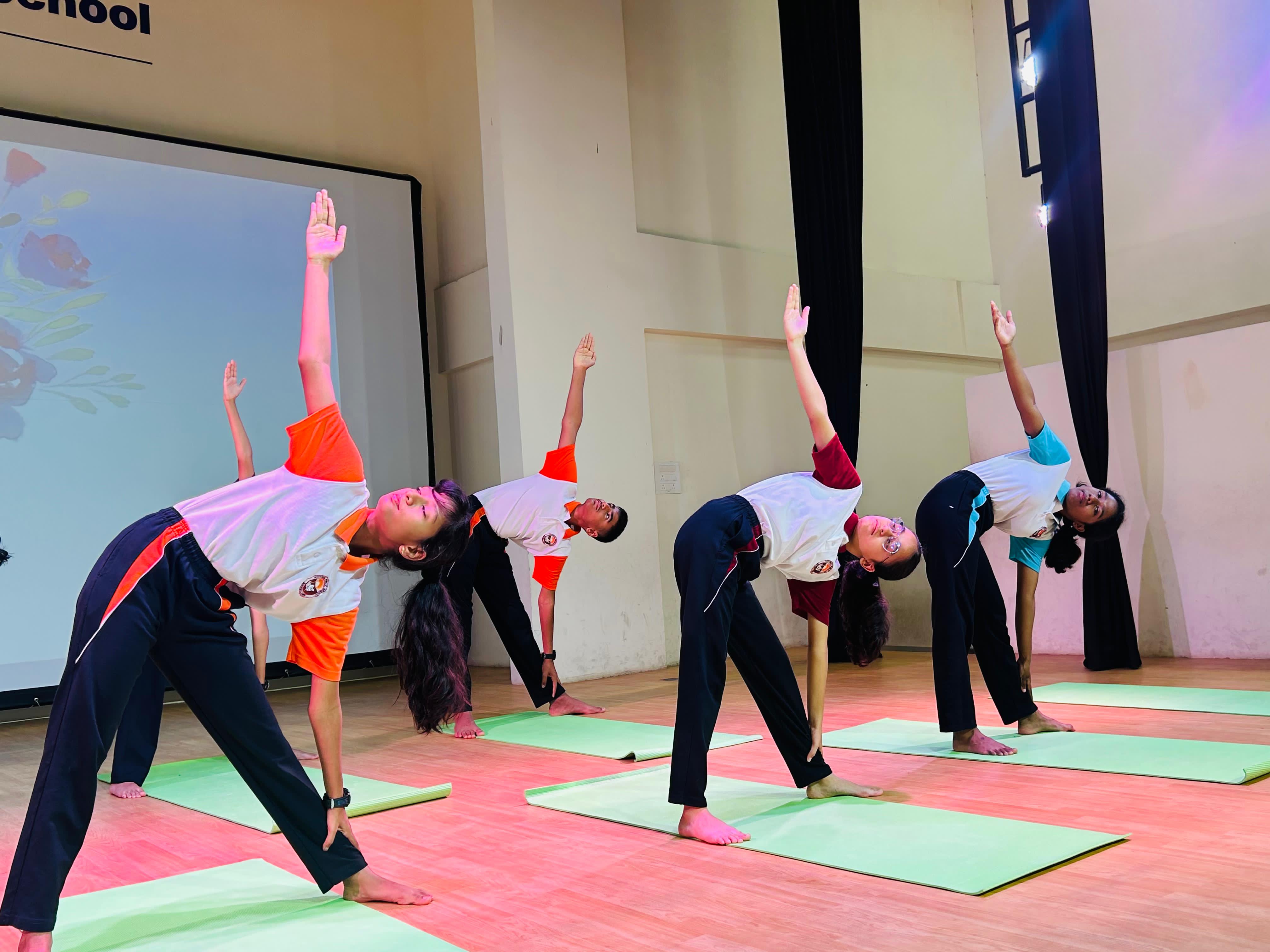 The school assembly on International Yoga Day was conducted by the students of Grade 9A with great enthusiasm, highlighting the importance of yoga in achieving harmony between the mind, body, and soul.