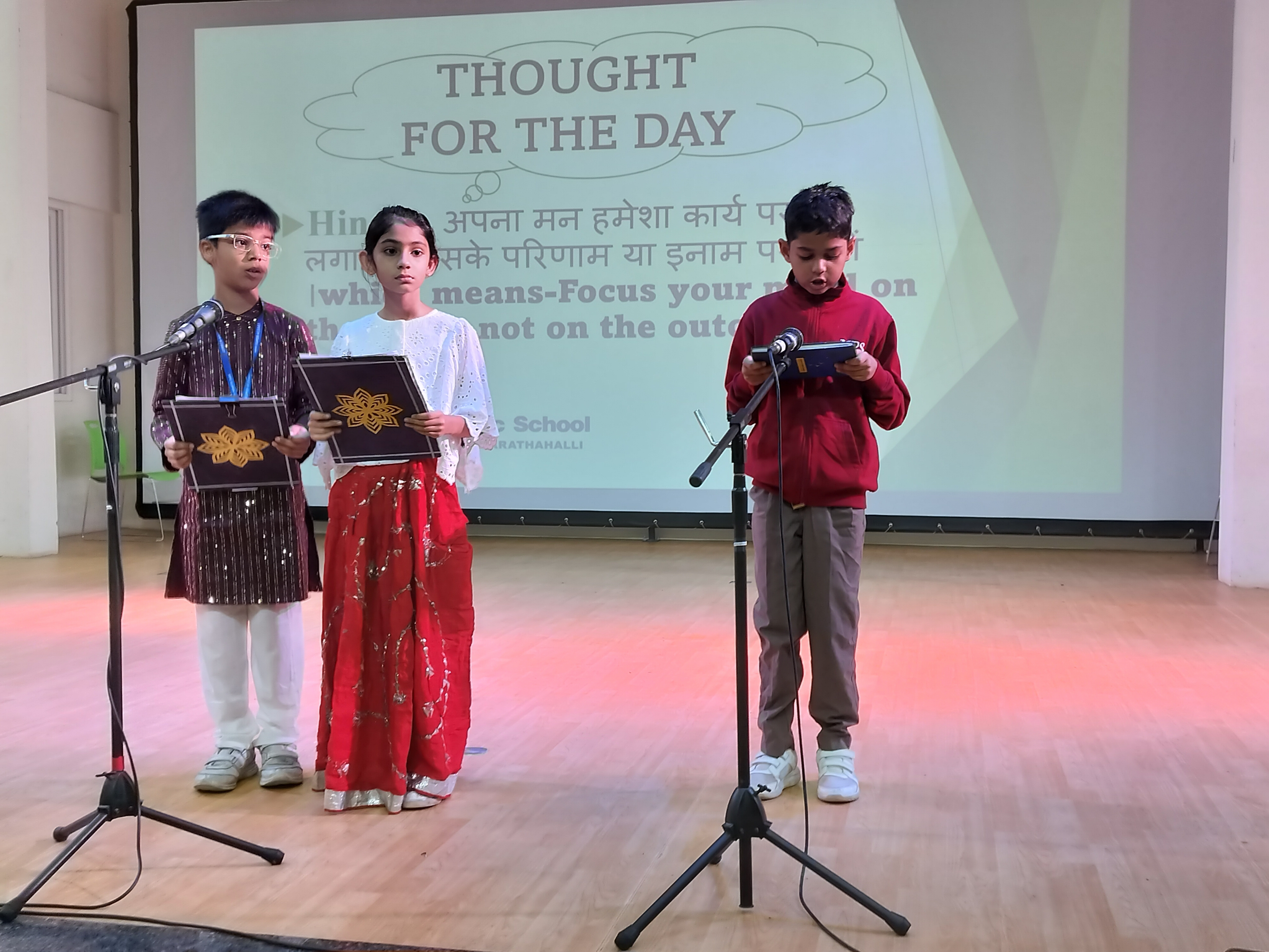 The programme commenced with a prayer, followed by the National Pledge and the Thought for the Day shared in three languages, English, Hindi, and Kannada, emphasizing unity in diversity. The Word of the Day, Devotional, beautifully conveyed the essence of spiritual love and dedication to the Lord.