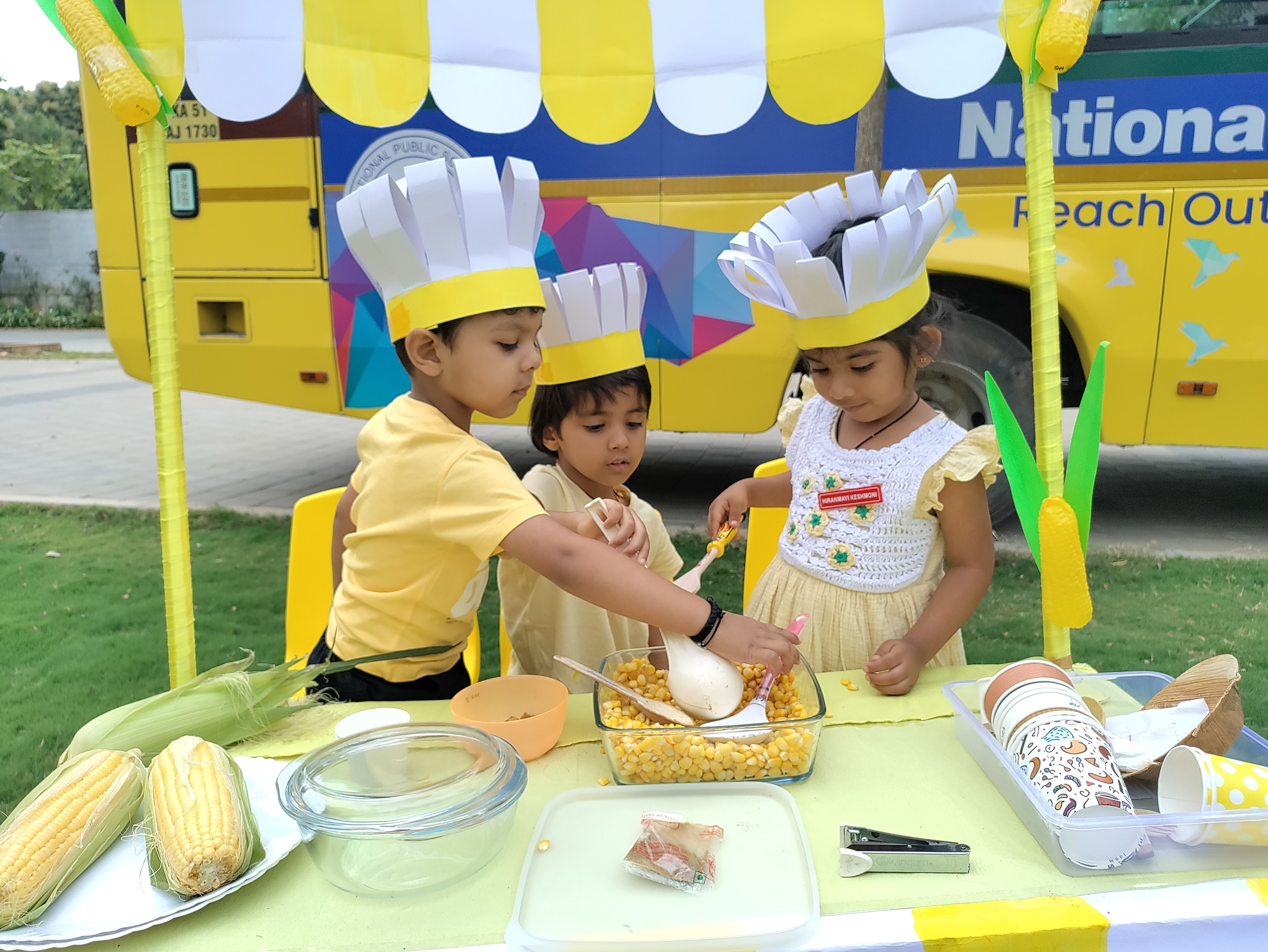 Nursery students lit up the day, dressed in sunny hues of yellow! They event began with a hands-on 'Corn Chaat' activity. Mixing boiled corn with salt, pepper, and lemon juice not only added flavour but also encouraged teamwork, sensory exploration, and fine motor skills. The fun continued with yellow-themed games like ball toss, colour sorting, clay modeling, and finger-painting on pineapple cutouts. The day ended with happy smiles, creative art, and joyful memories of the magic of yellow!