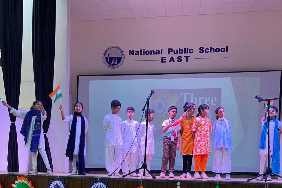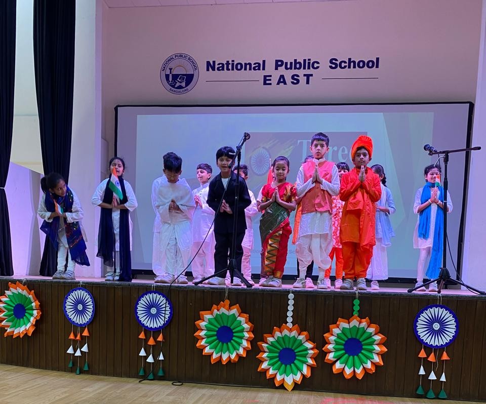 The school assembly on the inspiring theme "Great Indian Leaders, Great Lessons." The assembly began with the school prayer, followed by the National Pledge. The students then presented the Thought for the Day, which highlighted important values such as unity, courage, compassion, and honesty. The Thought for the Day was shared in Hindi, English, and Kannada, encouraging everyone to learn from the lives and teachings of great leaders.