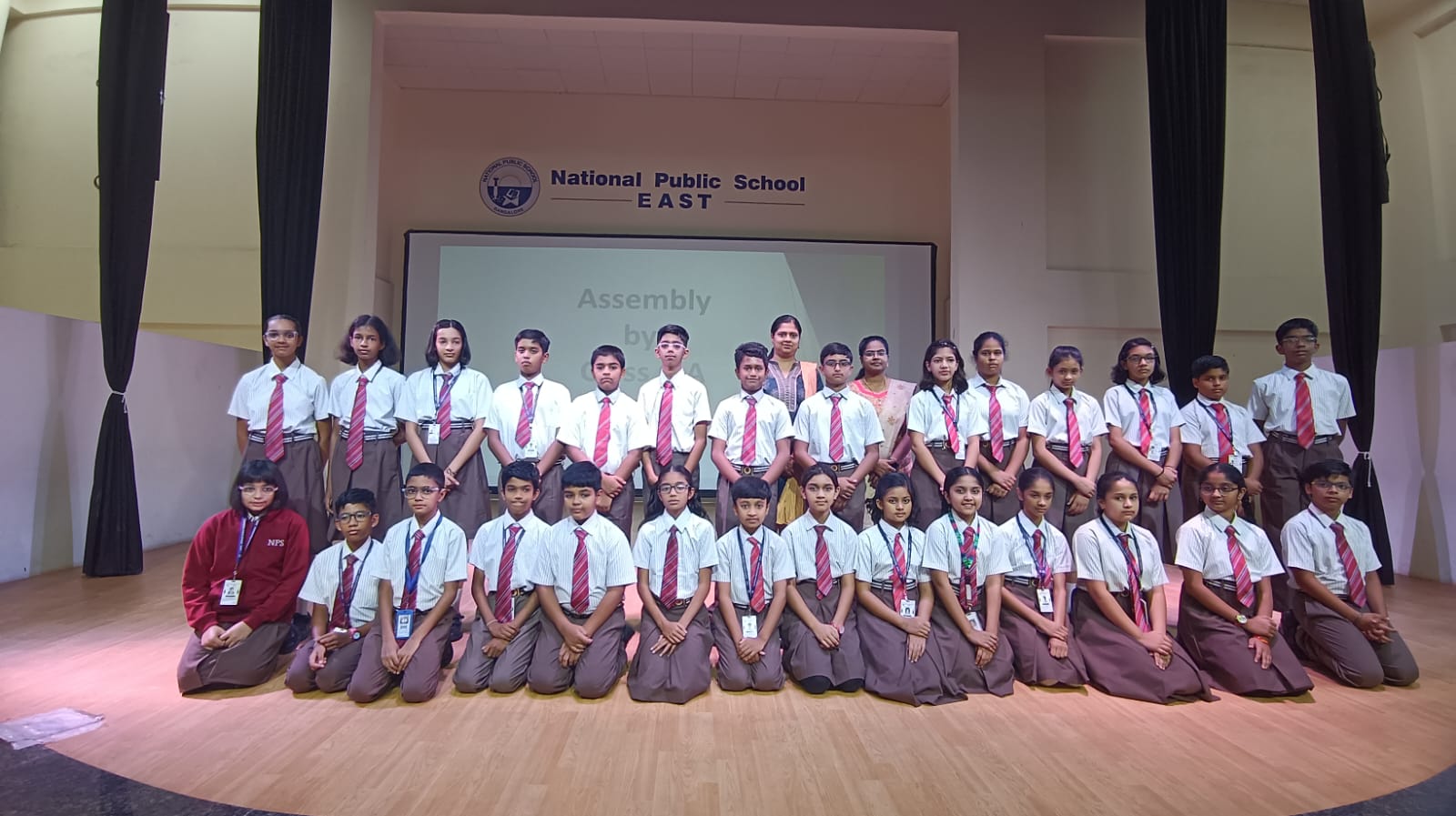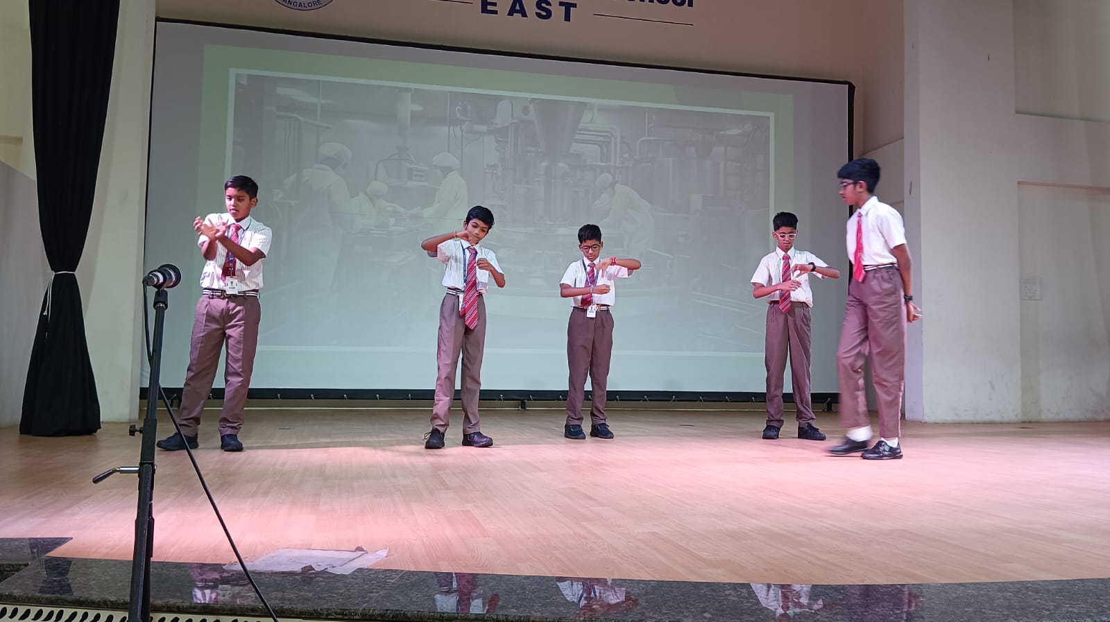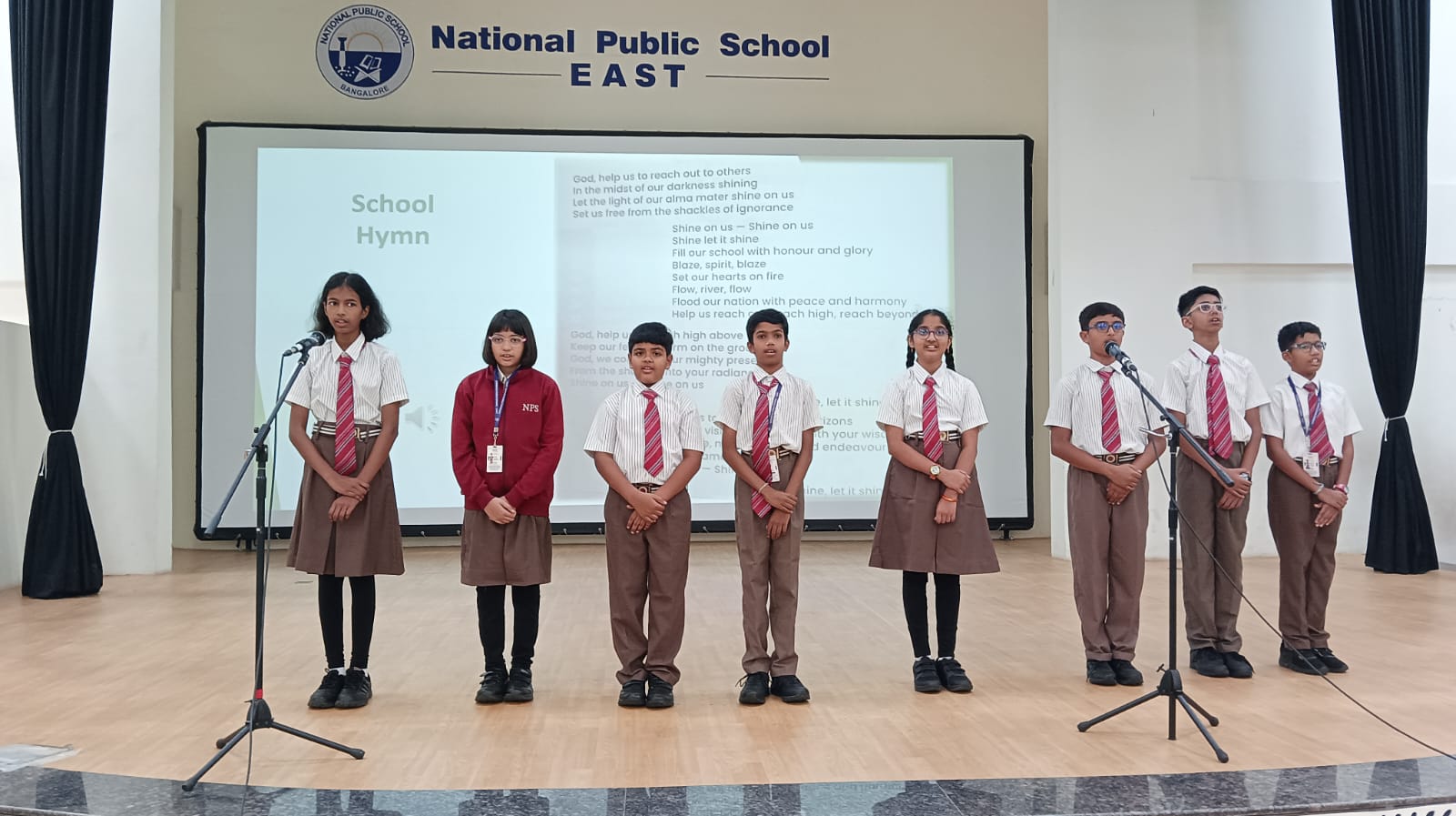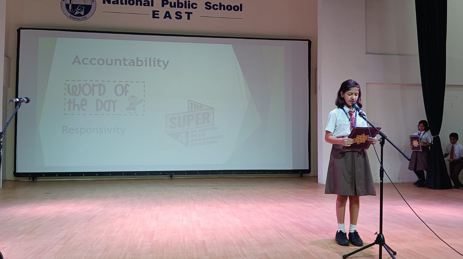 The programme began with the school prayer, followed by the National Pledge, creating an atmosphere of unity and reflection. Students then presented the Thought for the Day in English, Kannada, and Hindi. The Word of the Day, “Responsibility”, was introduced and explained, emphasizing the importance of owning one’s actions and understanding their impact on others.