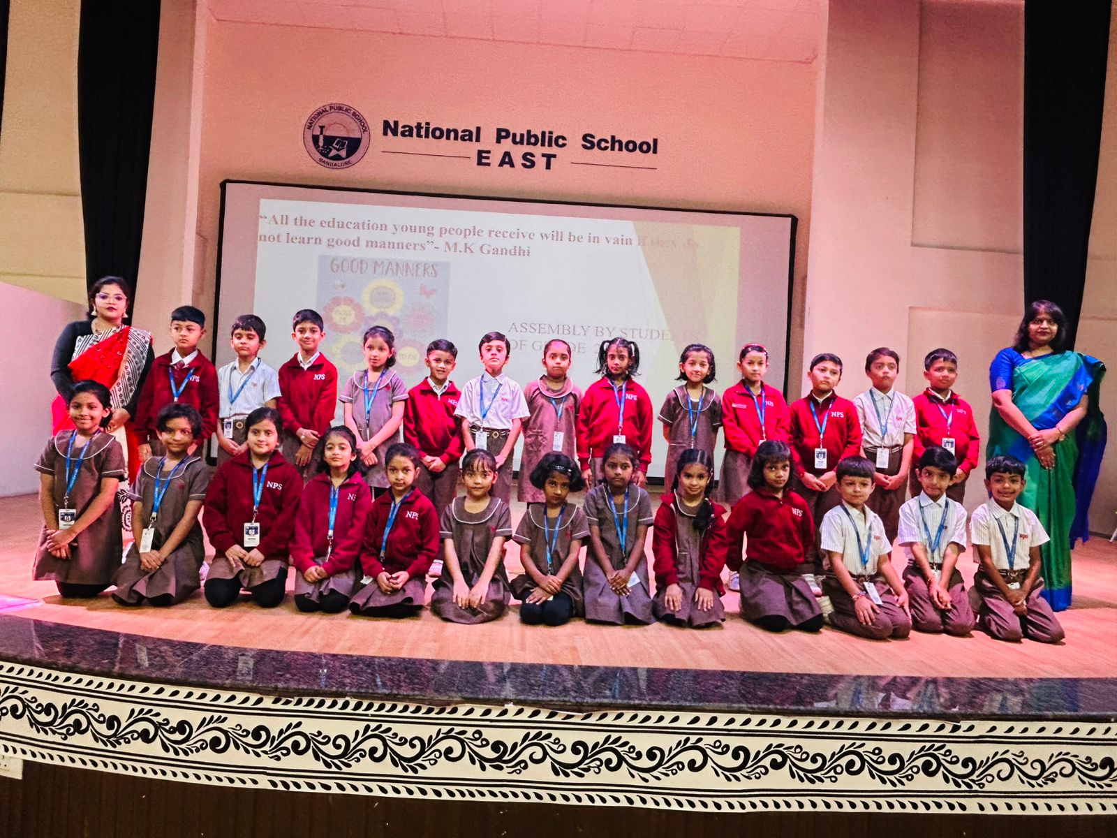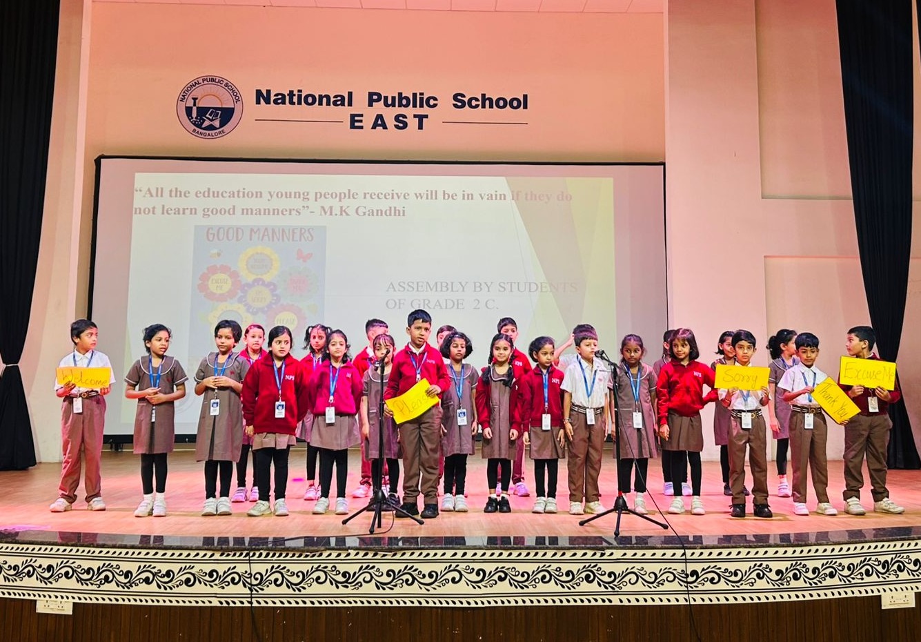 The assembly featured an energetic action song performed by the students, illustrating the importance of practicing good manners and learning moral values together. The lively performance received great applause from the audience.