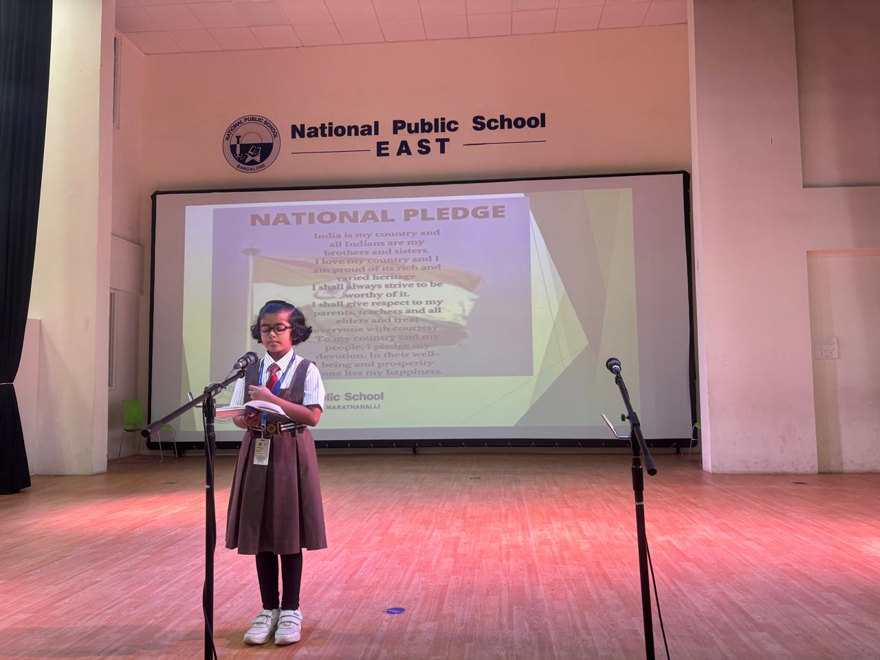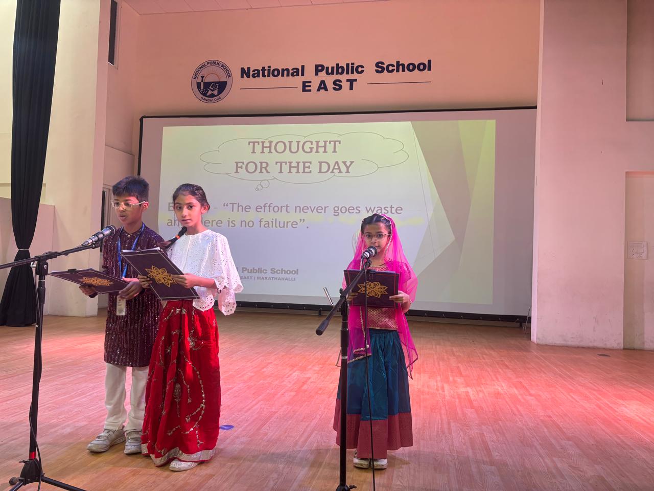 The programme commenced with a prayer, followed by the National Pledge and the Thought for the Day shared in three languages, English, Hindi, and Kannada, emphasizing unity in diversity. The Word of the Day, Devotional, beautifully conveyed the essence of spiritual love and dedication to the Lord.
