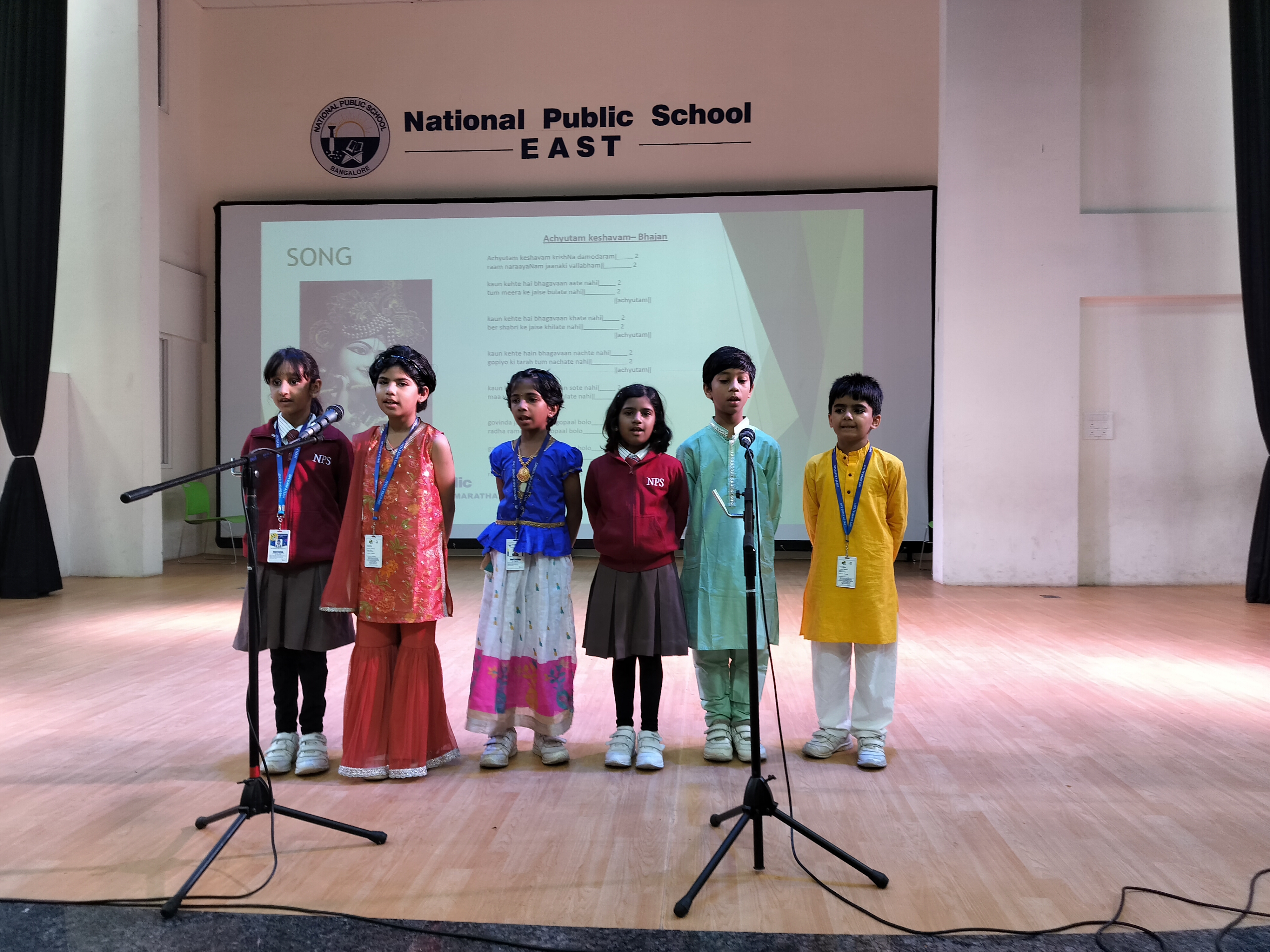 An inspiring speech was delivered, highlighting the story of Lord Krishna’s birth and its relevance in today’s world. The students then performed melodious songs expressing how sincere prayer and love for God can bring one closer to His divine presence.