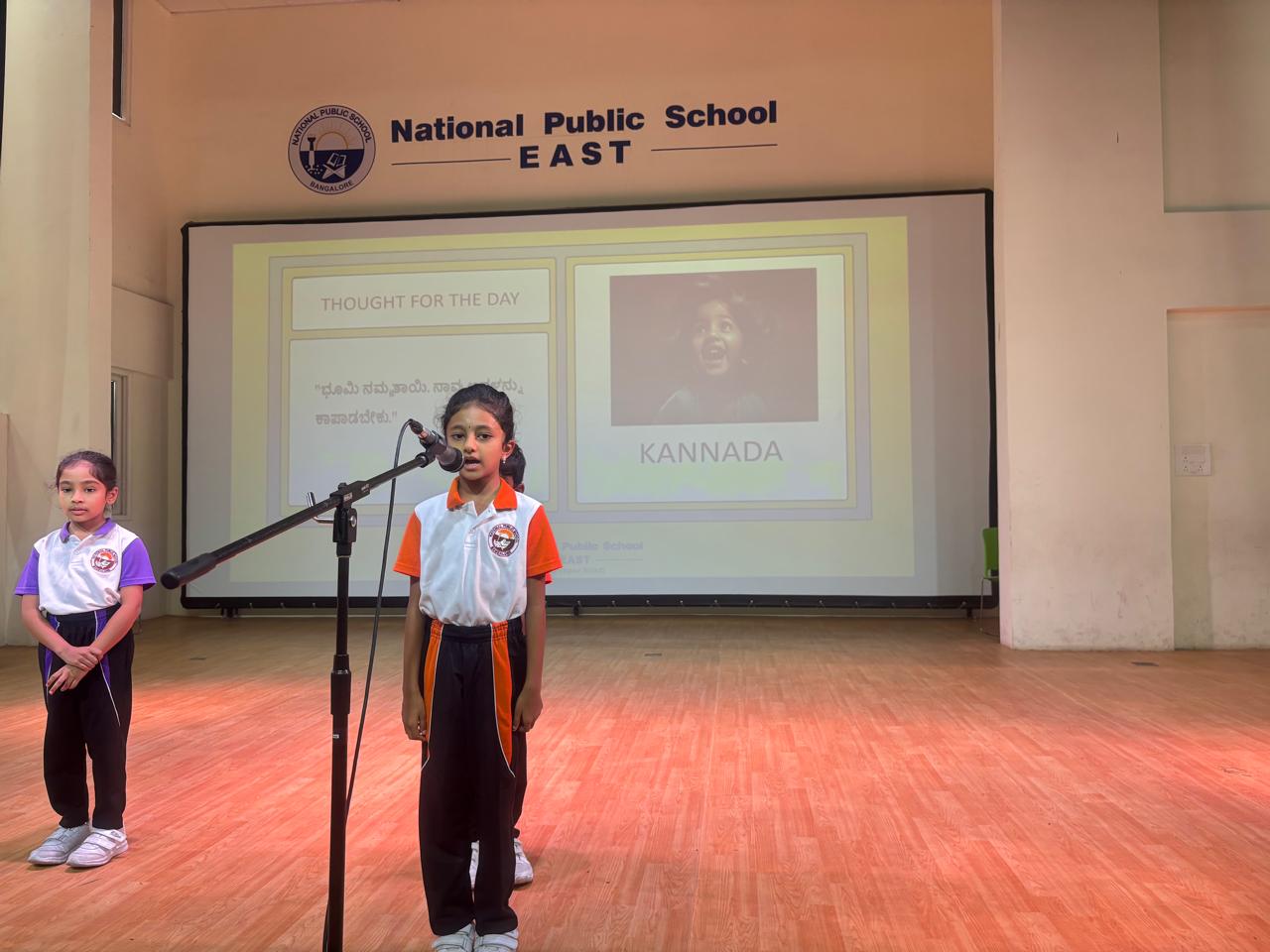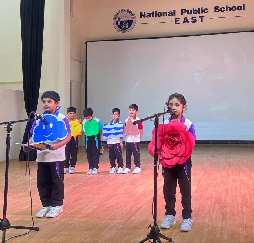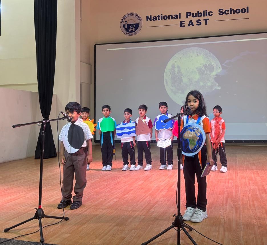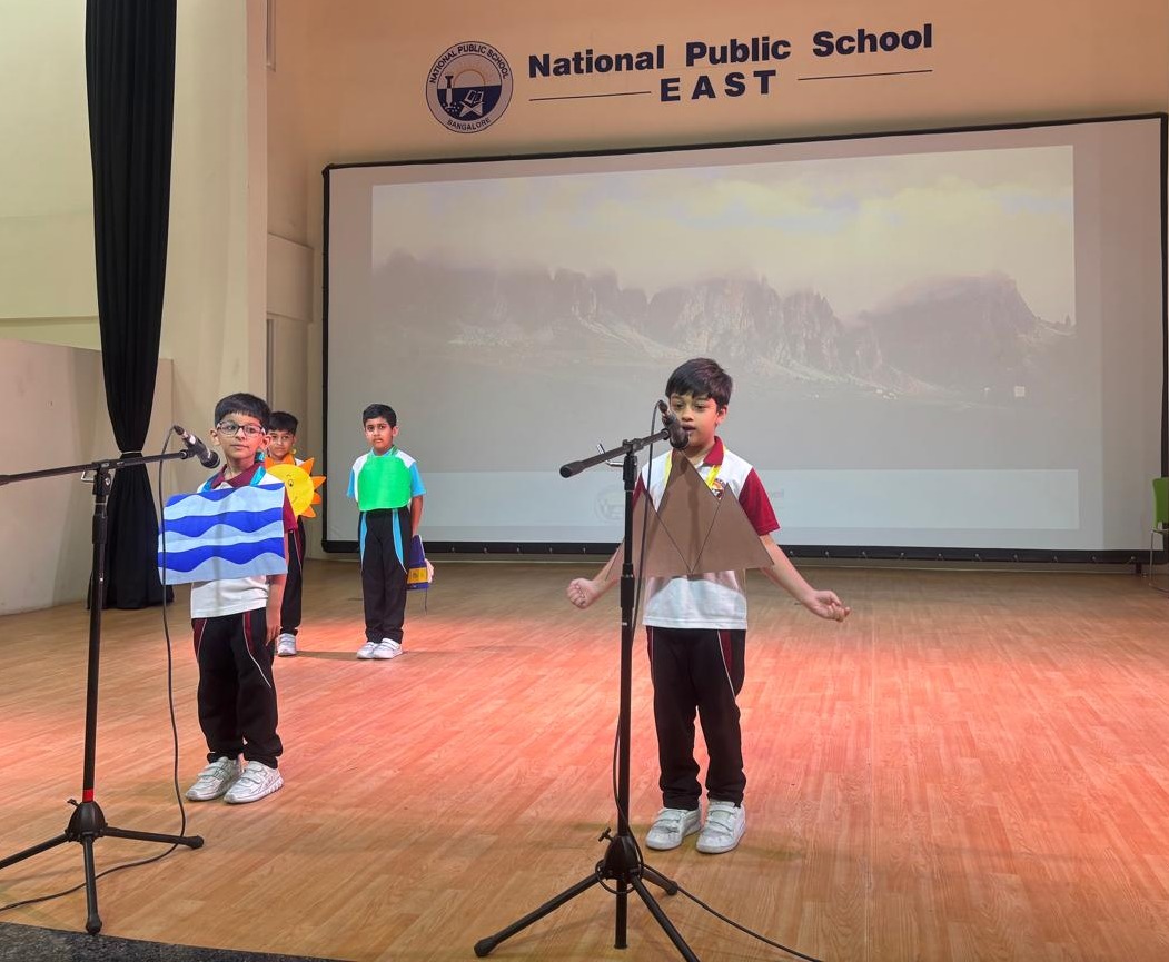 The programme commenced with the National Pledge, setting a tone of unity and responsibility. This was followed by the Thought for the Day in English, Hindi, and Kannada, each underscoring the importance of nurturing our planet with care and respect. The Word of the Day, (Sustainable) was thoughtfully explained, reminding everyone about the importance of using resources wisely to ensure a greener tomorrow.