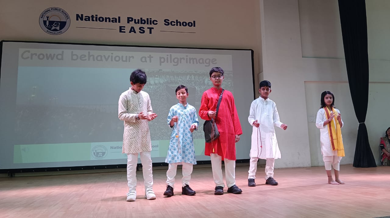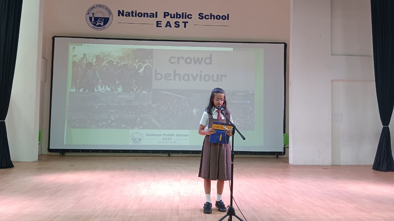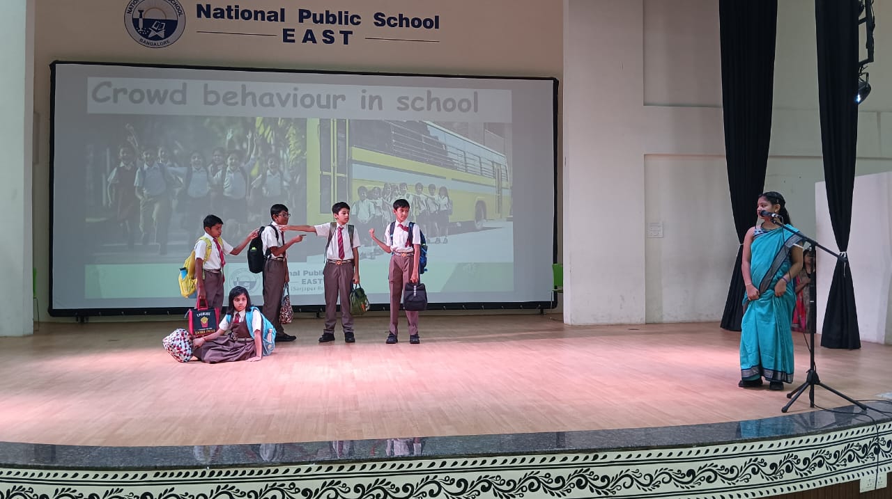 A general morning assembly was organized by the students of Grade 4A at NPS East. The event aimed to instill awareness about crowd behavior and herd mentality, emphasizing the importance of maintaining individuality, calmness, and rational thinking in group settings. Students learned that one person’s responsible action can positively influence many.