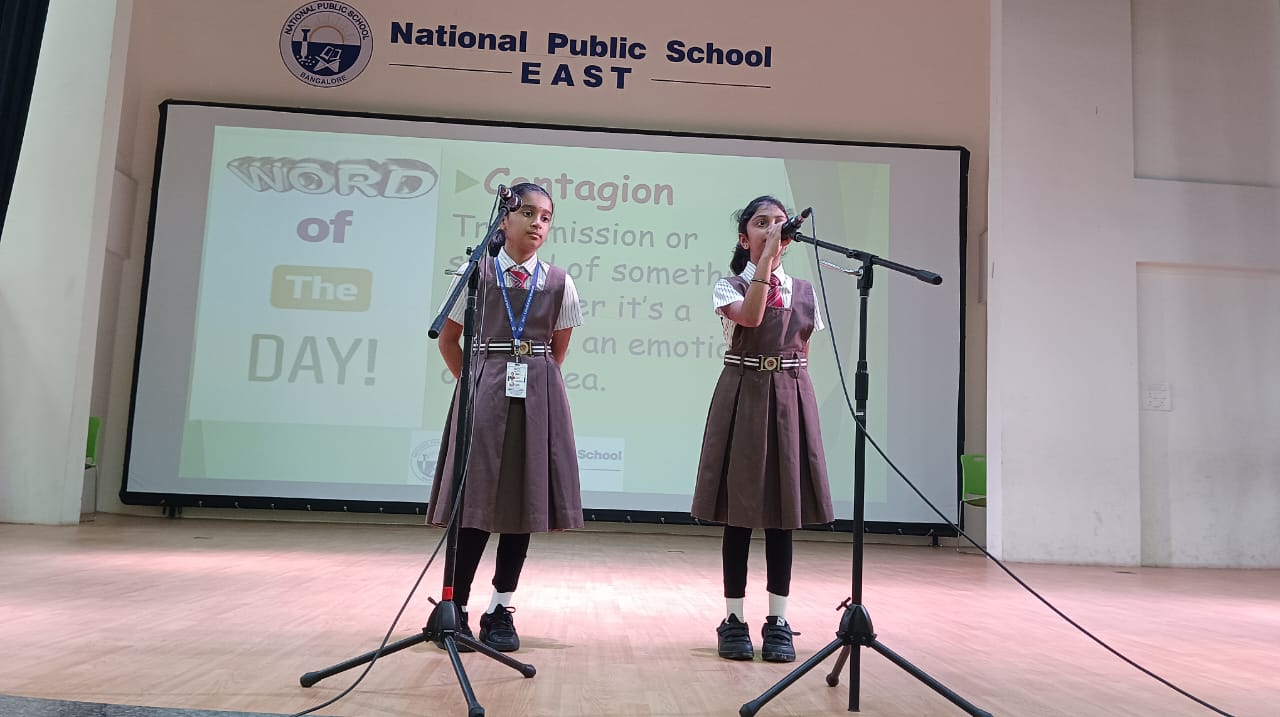 The assembly began with the school prayer, followed by the National Pledge and the school hymn. Motivating thoughts for the day were presented in different languages, and the Word of the Day was introduced along with its meaning and usage.