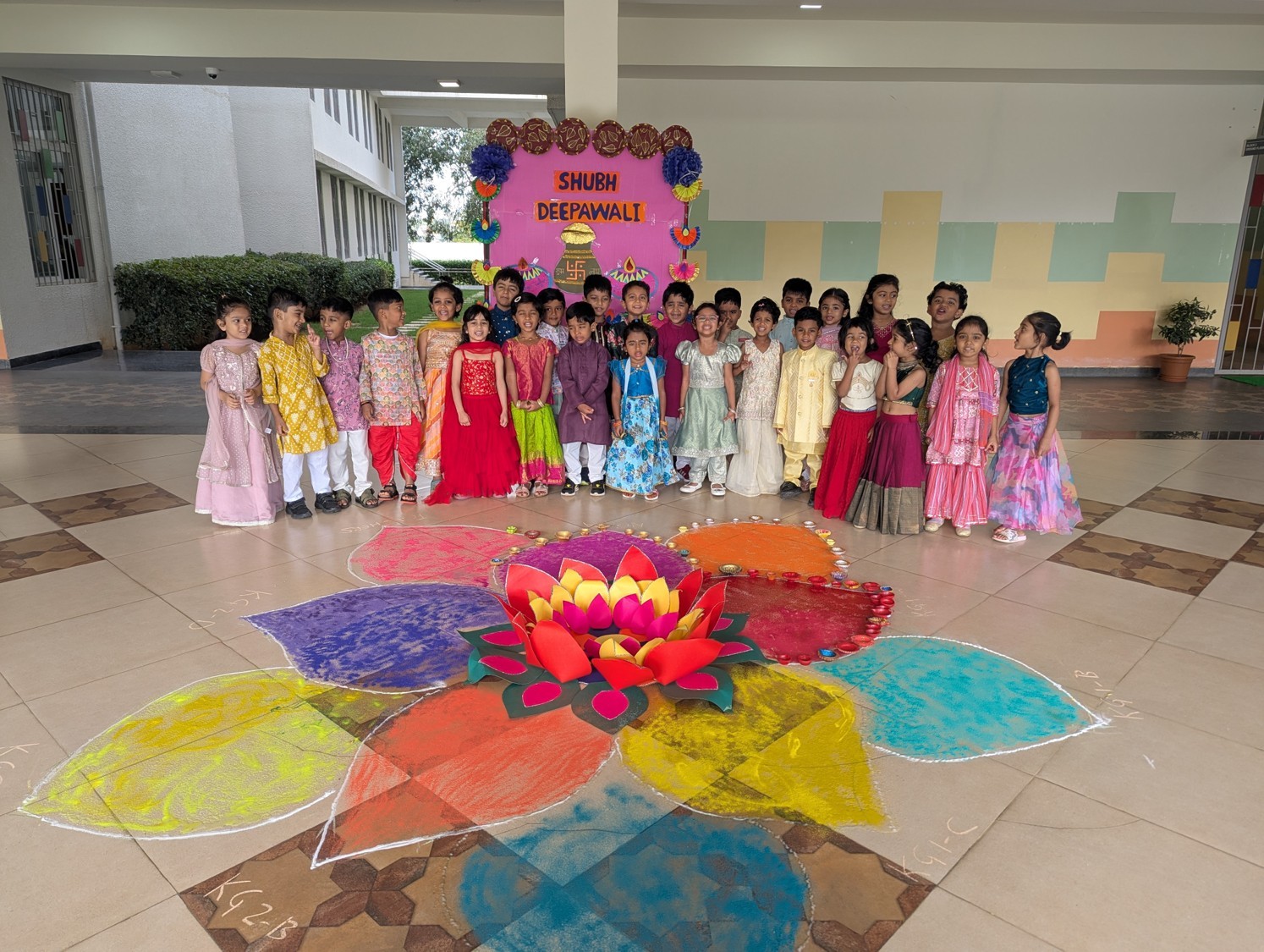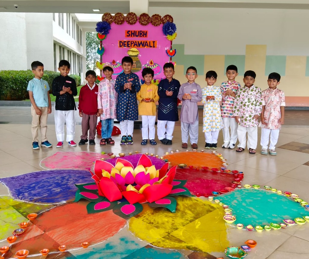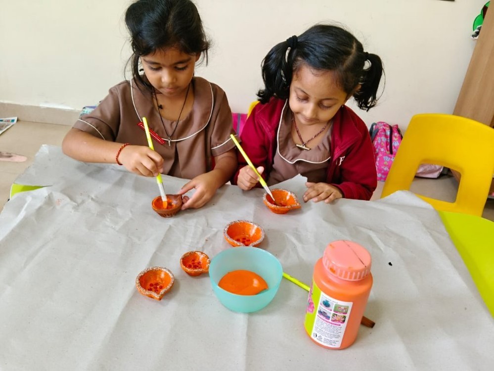 Dressed in colourful attire, the students of KG 1 C took the stage and delighted everyone with their performance through a skit, dance and song sequence. This class assembly captured the essence of the festival emphasizing love, togetherness and joy of gifting. As part of the festivities, Pre-Primary students engaged in a creative diya painting activity, adding a splash of creativity to the clay diyas.