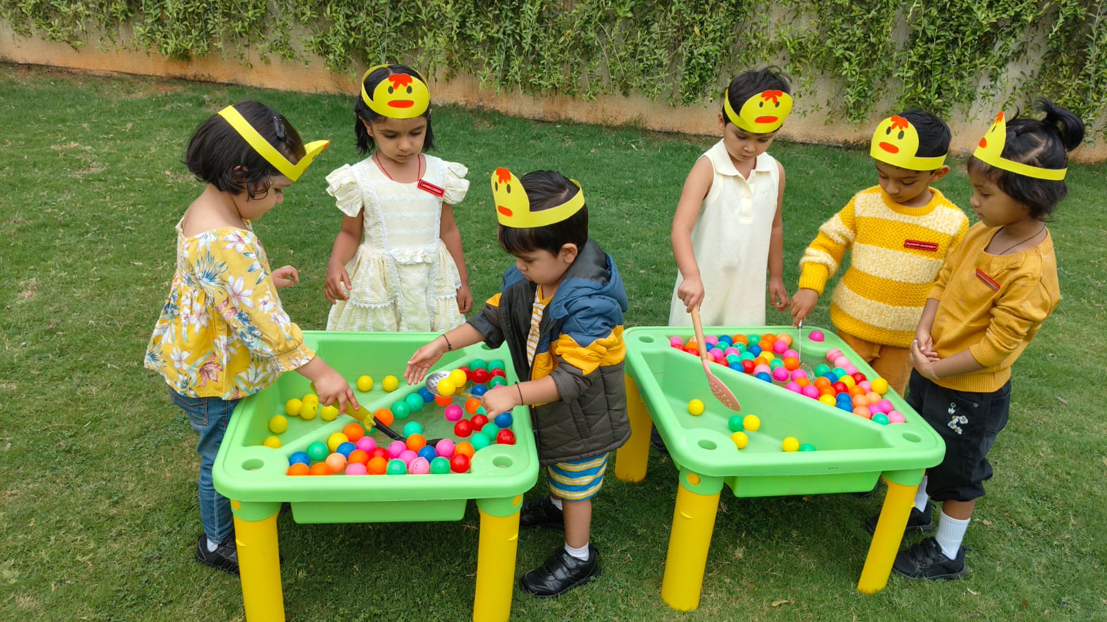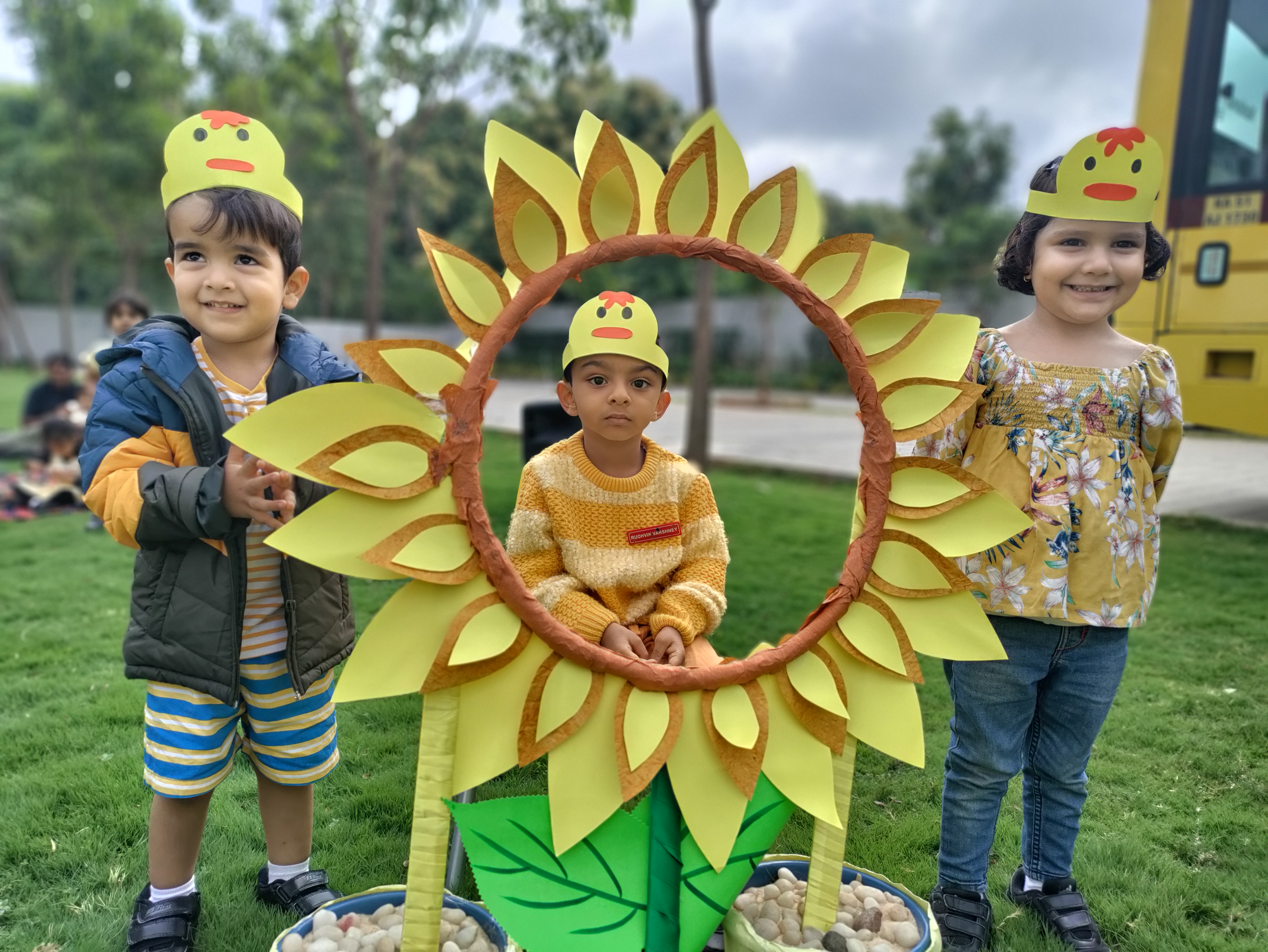 Nursery students lit up the day, dressed in sunny hues of yellow! They event began with a hands-on 'Corn Chaat' activity. Mixing boiled corn with salt, pepper, and lemon juice not only added flavour but also encouraged teamwork, sensory exploration, and fine motor skills. The fun continued with yellow-themed games like ball toss, colour sorting, clay modeling, and finger-painting on pineapple cutouts. The day ended with happy smiles, creative art, and joyful memories of the magic of yellow!